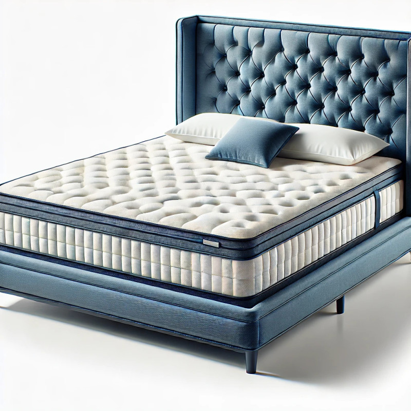 Ekskluzywne łóżko kontynentalne o eleganckim, tapicerowanym wykończeniu w kolorze granatowym. Składa się z trzech warstw dla maksymalnego komfortu: solidnej podstawy, wysokiej jakości materaca oraz miękkiego toppera. Idealne do sypialni w stylu nowoczesnym.