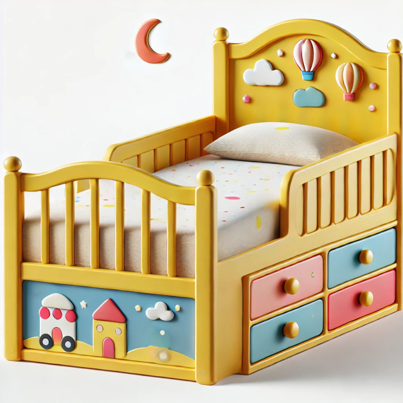 Kolorowe łóżko dziecięce w odcieniu ciepłej żółci. Zaprojektowane z myślą o najmłodszych, z zaokrąglonymi krawędziami dla bezpieczeństwa i dodatkowymi szufladami na zabawki lub pościel. Idealne do tworzenia przyjaznej przestrzeni dla dzieci.