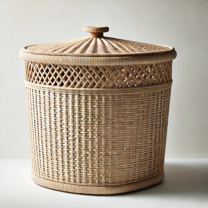 Pojemny kosz na pranie z pokrywą, wykonany z naturalnych materiałów. Elegancki design pasuje do nowoczesnych i klasycznych wnętrz łazienek.